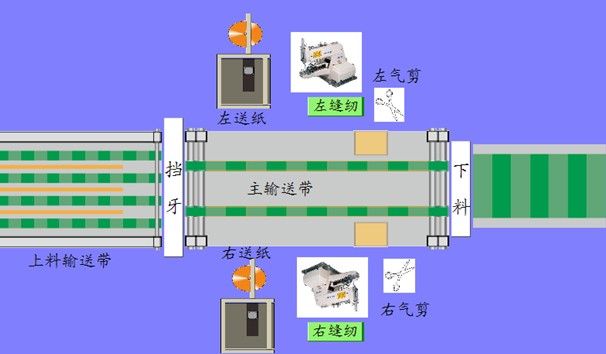 水泥袋双头缝边机主要包括上料输送带,挡牙,主输送带,下料输送带,工业缝纫机,送纸机,气剪等几个部分。其中上料输送带、主输送带、工业缝纫机由变频器驱动,要求在工作时它们的线速度相同。上料输送带开机后一直运行,编织袋被工人手动投放在上料输送带上。气动挡牙按照触摸屏上设定的间距将袋子分隔开,当投袋子间距大于设定间距时,主输送带和缝纫机停机,等待上料输送带上的编织袋子到达挡牙位置时,主输送带和缝纫机停机又继续运行;当投袋子间距小于设定间距时,主输送带和缝纫机不停机。这样才能保证高效率地生产运行。