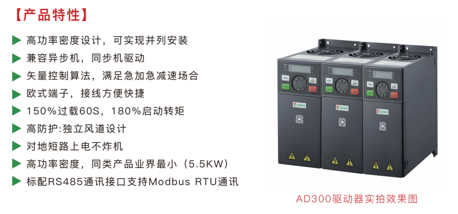 AD300 系列紧凑型变频器是科沃电气基于小功率、小体积、高性价比的市场需求,针对性推出简易型变频器。具有高功率密度、高可靠性、高防护、高颜值、高性能等显著优势,同时具备易安装、易调试等产品特点。可广泛适用于用于物流、包装、食品、 风机、拉丝、研磨、塑料、水泵及各种自动化生产设备的驱动。